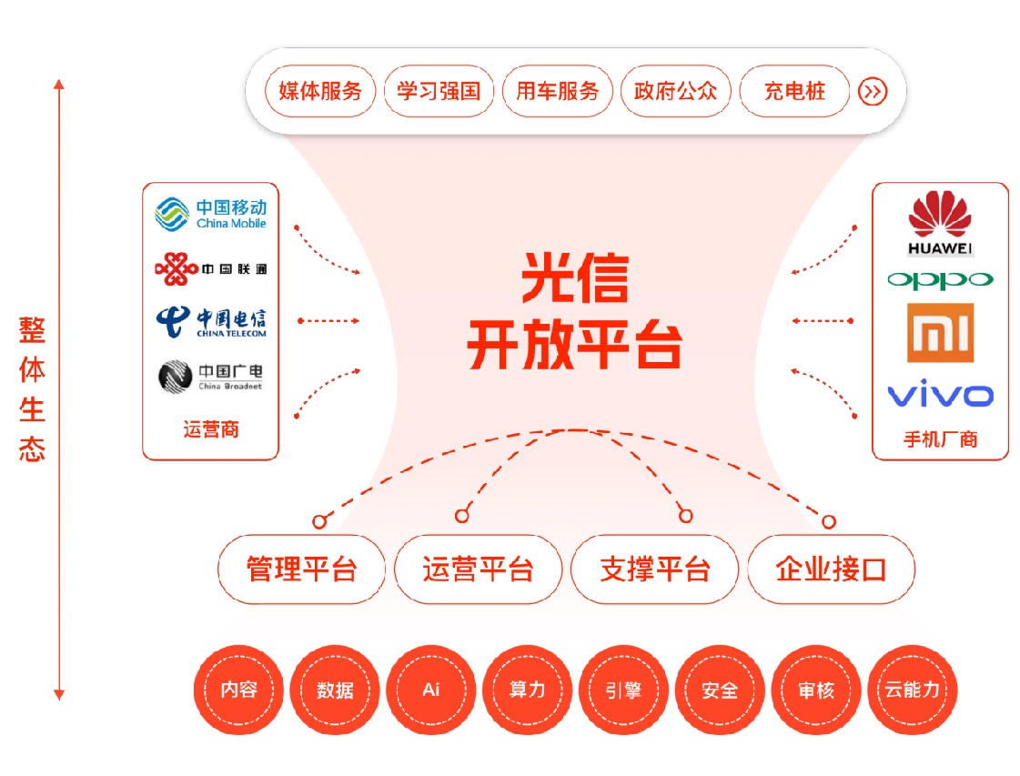 基于国家5G战略、5G新基建和国家媒体融合战略,赋能行业企业服务,面对数据经济时代挑战,通过融合媒体服务、移动终端、移动互联网,开辟新价值链接和触达服务新模式、新生态建设。使用光信 直接内容到人、数字惠民。